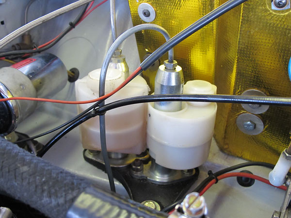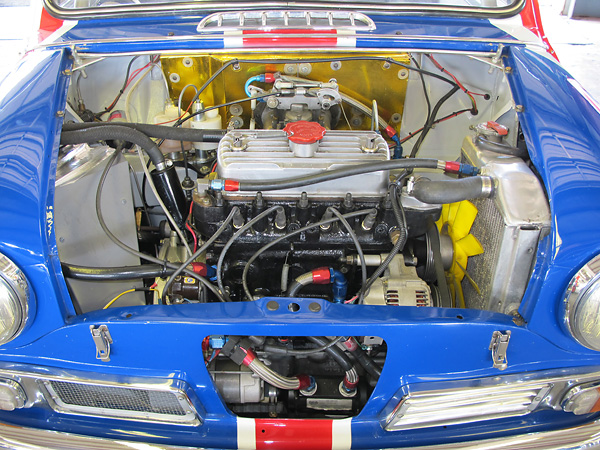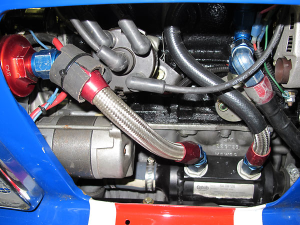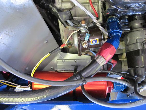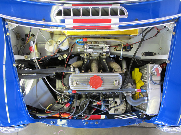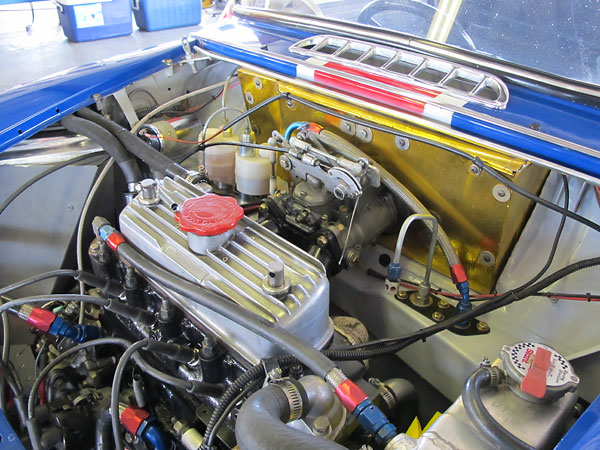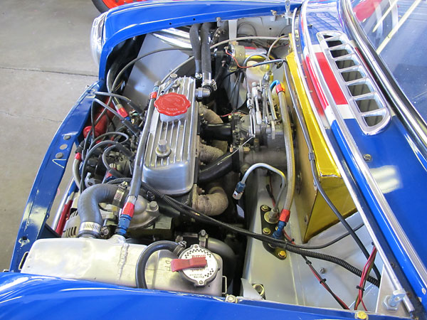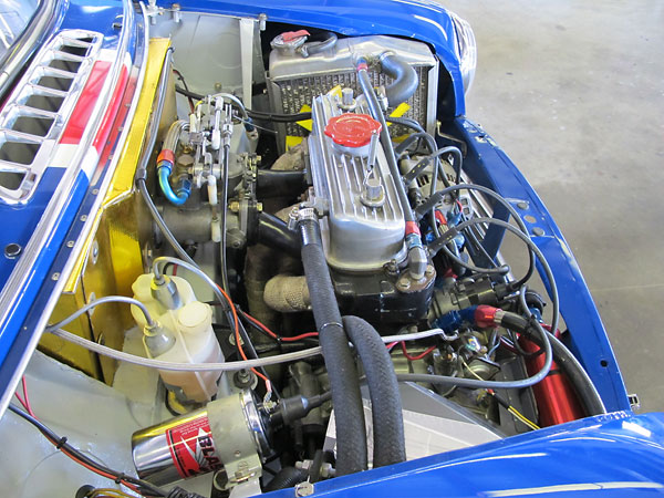 Engine: Weber 45DCOE carburetor. Lucas distributor. Pertonix Ignitor breakerless ignition module. MSD Blaster 2 ignition coil. 7mm Hi-Temp spark plug wires. MSD adjustable rev limiter, part number 8672 (6000-8200rpm). Accusump? Peterson Fluid Systems 400-series billet aluminum oil filter. Finned aluminum valve cover. Moroso aluminum breather tank.